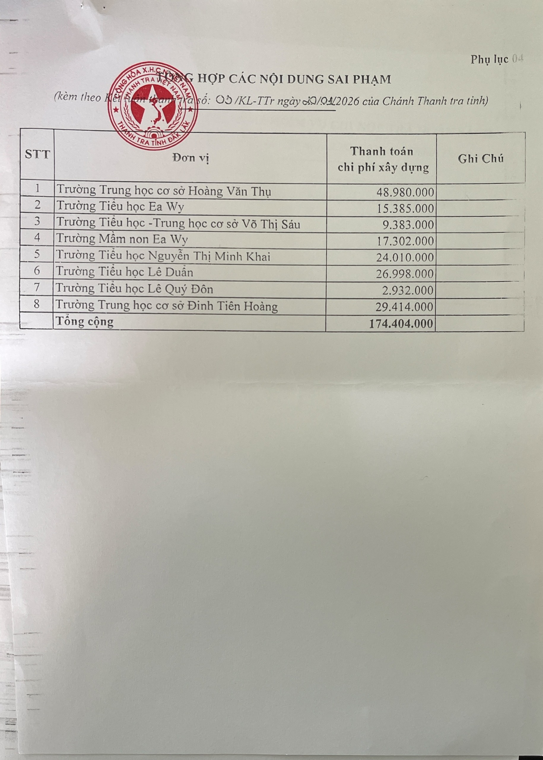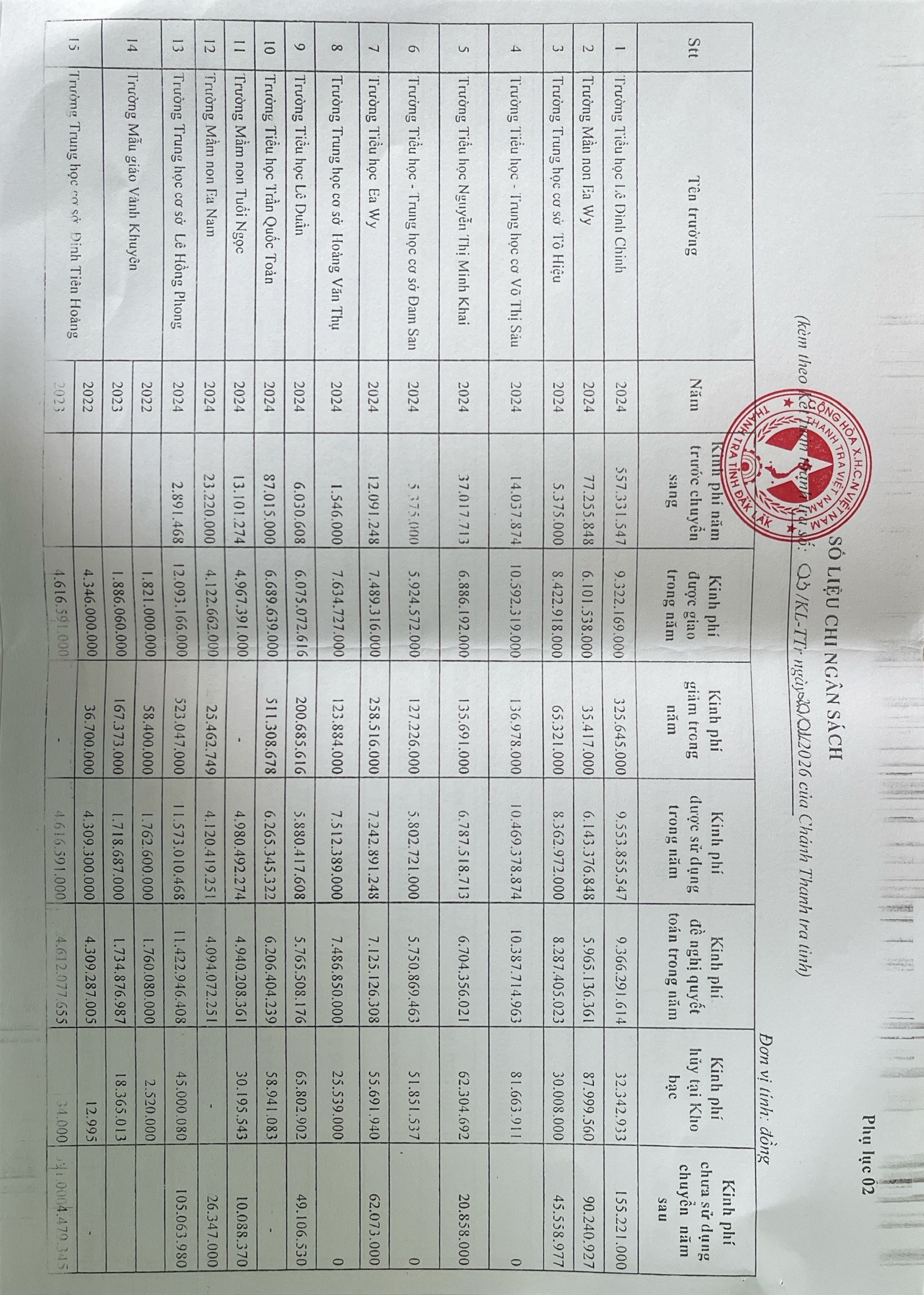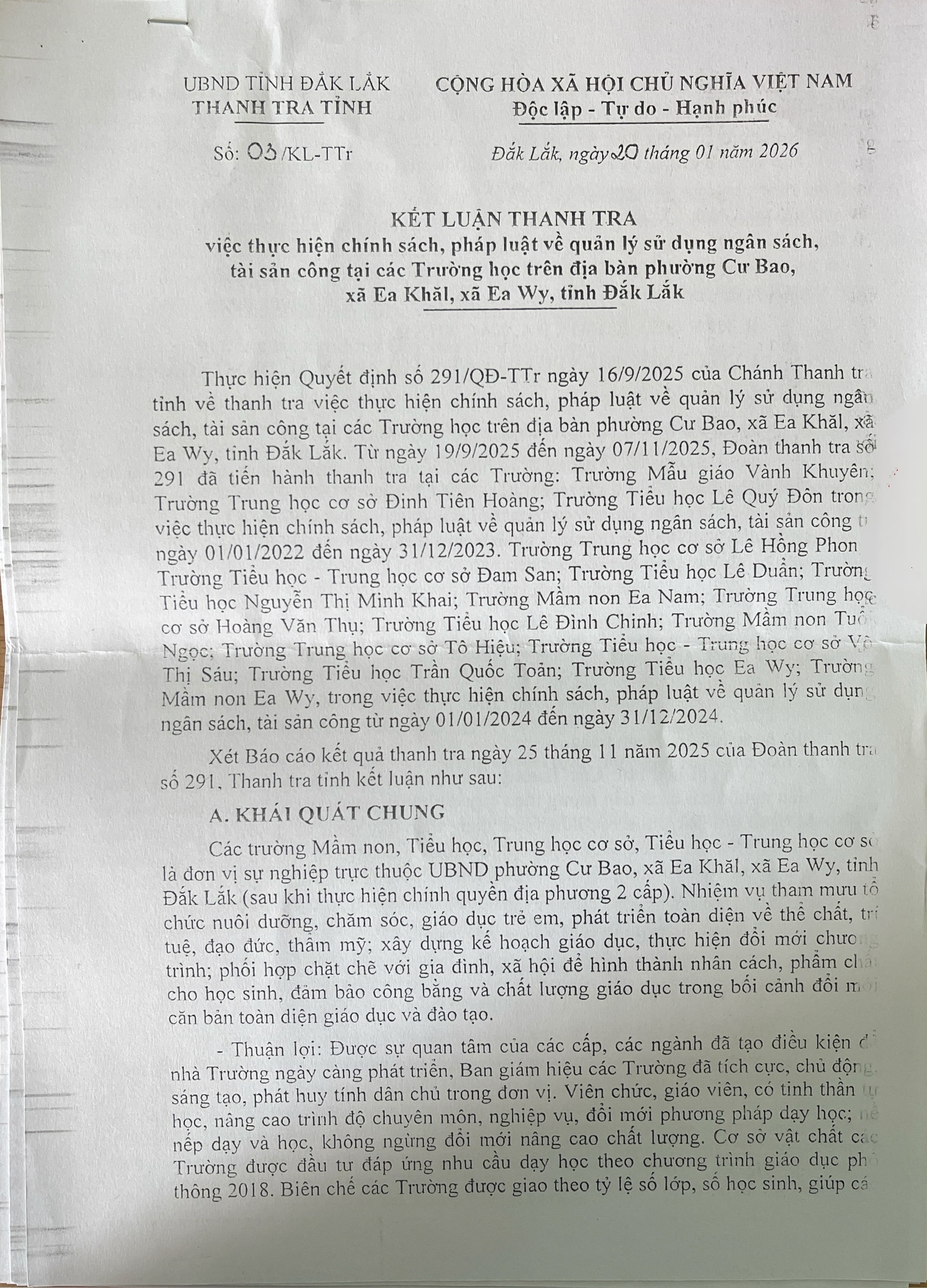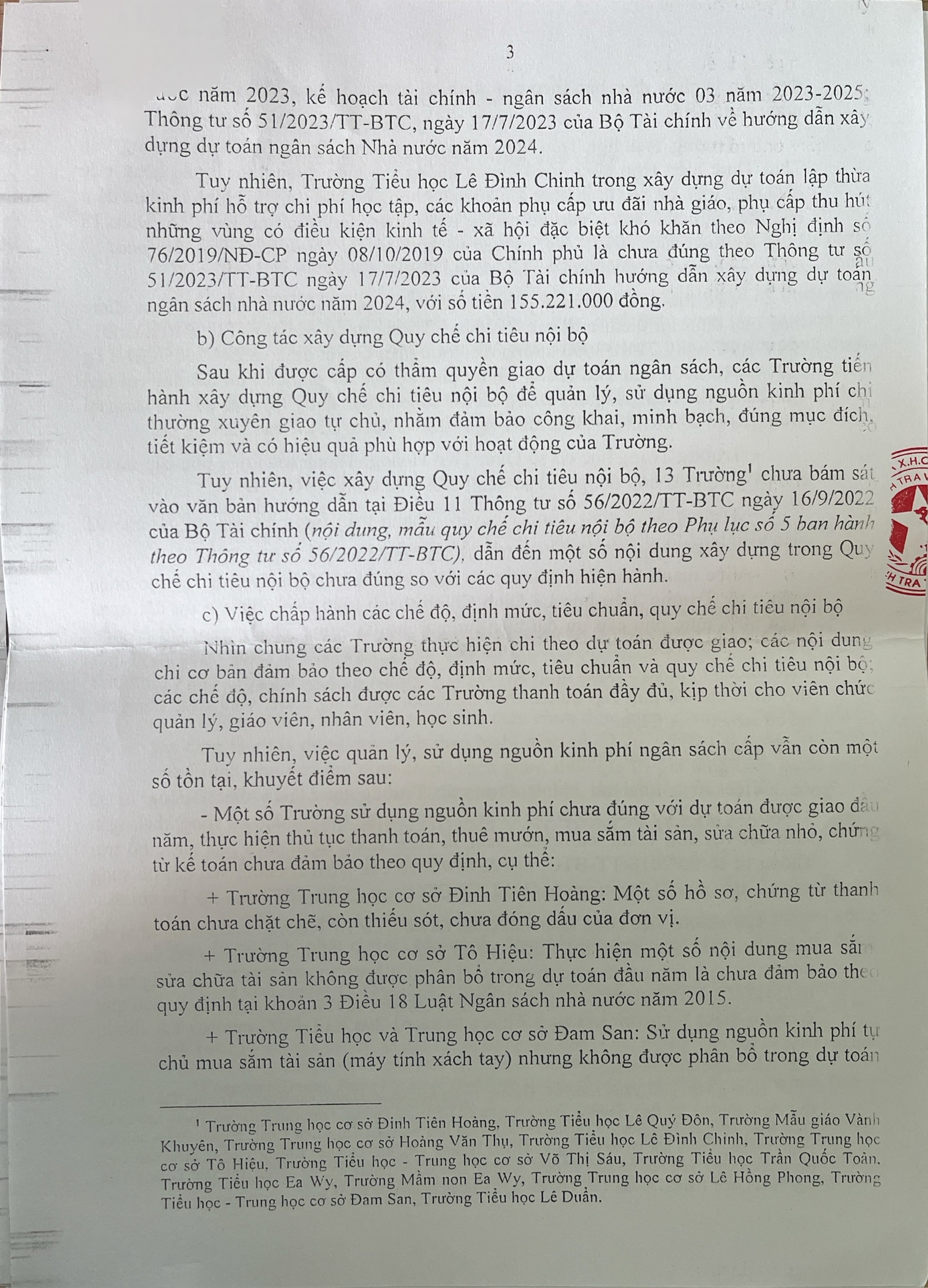 Kết luận thanh tra việc thực hiện chính sách, pháp luật về quản lí sử dụng ngân sách tài sản công tại các trường học trên địa bạn Phường Cư Bao, xã Ea Khăl, xã Ea Wy, tỉnh Đắk Lắk,